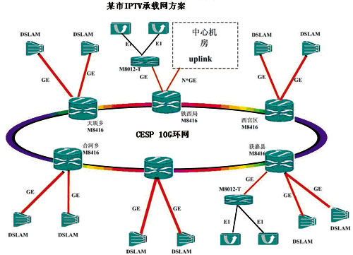 下面簡單介紹一下網(wǎng)通某地市基于CESP的IPTV承載網(wǎng)方案。傳統(tǒng)的IPTV承載都是通過2.5G MSTP或RPR千兆環(huán)來傳輸流媒體數(shù)據(jù)的,其問題在于:按照現(xiàn)有的IPTV用戶數(shù)和明年計劃發(fā)展用戶數(shù),平均每個村有近50個IPTV用戶,一般一個鄉(xiāng)要管轄30個村。按照每戶IPTV 2M的帶寬分配,一個鄉(xiāng)就需要3G的接入帶寬才能滿足業(yè)務(wù)發(fā)展的需求,而現(xiàn)有的千兆環(huán)和2.5G MSTP根本就無法滿足日益膨脹的數(shù)據(jù)業(yè)務(wù)需求。因此,亟須采用一種全新的數(shù)據(jù)承載平臺來改造現(xiàn)有的縣、鄉(xiāng)、村的數(shù)據(jù)接入網(wǎng)絡(luò)。