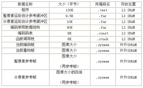 經(jīng)過優(yōu)化的程序和常用的數(shù)據(jù)結(jié)構(gòu)的大小可以放在L2中。所以按照上面的分析將L2配置為256KBSRAM,將程序代碼段(.text)、變量初值表(.cint)、常量字符串(.const)、全局變量靜態(tài)變量(.bss/.far)、堆棧段(.stack)等放入L2SRAM當(dāng)中,全局堆(.sysmem用于動(dòng)態(tài)存儲(chǔ)器分配)置于外部存儲(chǔ)器。表1總結(jié)了編碼器所要用到的存儲(chǔ)空間分配情況。