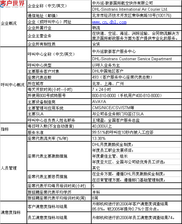 中外運敦豪客戶服務(wù)中心現(xiàn)主要負(fù)責(zé)DHL中國客戶呼入業(yè)務(wù),公司在北京(北方區(qū))、上海(東方區(qū))、廣州(南方區(qū))分別設(shè)立區(qū)域級呼叫中心,采用全國免費客戶服務(wù)熱線800-810-8000接入,并使用400-810-8000為手機用戶提供服務(wù)。除了電話,還開通多種客戶溝通和聯(lián)絡(luò)渠道。在運營方面執(zhí)行嚴(yán)格的行業(yè)質(zhì)量標(biāo)準(zhǔn)體系,在預(yù)定取件、服務(wù)咨詢、跟蹤查詢、服務(wù)補救、重要客戶支持、電子商務(wù)受理過程中精益求精,為客戶提供全天候、一站式、個性化的信息、數(shù)據(jù)和客戶服務(wù),與客戶建立長期的伙伴關(guān)系。