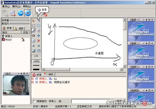 可以看到該系統(tǒng)提供了多路視頻展示與共享文檔顯示區(qū)、文本交流、文檔共享、語音交流等多種交互手段,各用戶可以在主席的協(xié)調下使用各項功能輕松地實現(xiàn)實時交流與網(wǎng)絡協(xié)作。