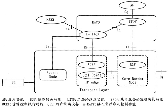 RACS是NGN的組成部分之一,將業(yè)務(wù)層的資源需求與網(wǎng)絡(luò)承載層的資源分配相關(guān)聯(lián),主要完成策略控制、資源預(yù)留、接納控制、網(wǎng)絡(luò)地址轉(zhuǎn)換(NAT)和防火墻穿越等功能。RACS通過一系列策略為應(yīng)用提供基于傳輸?shù)目刂品⻊?wù),只要該應(yīng)用支持RACS接口,RACS就能保證任意應(yīng)用能夠請(qǐng)求到與其服務(wù)相匹配的傳輸資源。同時(shí),RACS為運(yùn)營商提供多種不同接納控制的方法,并設(shè)置各自的承載服務(wù)策略。RACS為各種服務(wù)提供獲得網(wǎng)絡(luò)資源的方法,使得用戶終端可以獲得所提供服務(wù),其總體功能結(jié)構(gòu)如圖3所示[5]。