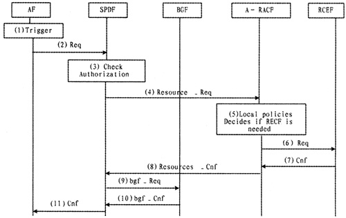 當(dāng)收到來自SPDF的資源請(qǐng)求后,A-RACF便按照其事先從NASS收到的用戶接入清單進(jìn)行鑒別。如果A-RACF核對(duì)從SPDF收到的QoS請(qǐng)求信息可以提供,即接受該請(qǐng)求,并且A-RACF在RCEF中加載該傳輸策略。RCEF實(shí)施A-RACF傳送過來的二層/三層媒體流策略,完成門控、QoS標(biāo)記、帶寬限制等功能。如圖6即為AF請(qǐng)求資源時(shí)的具體消息流[7]。