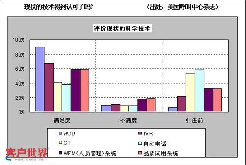 這是調(diào)查美國客服中心的管理者們?nèi)绾卧u價(jià)自己公司引進(jìn)技術(shù)的統(tǒng)計(jì)表。雖然“滿意”并不意味著“相關(guān)技術(shù)被有效利用”?墒菑恼{(diào)查結(jié)果來看,他們對技術(shù)的滿意度相當(dāng)高,并且看起來都在有效利用相關(guān)技術(shù)。
