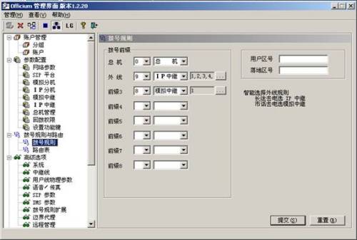 IP PBX 進(jìn)行配置(如圖)。人機(jī)界面簡(jiǎn)潔易懂,即便是不懂通訊的外行人,在看過(guò)說(shuō)明書(shū)后也能輕松自如地使用。配置起來(lái)簡(jiǎn)單,例如選擇外線撥號(hào)前綴號(hào)、做呼叫中心時(shí)的ACD輪循分機(jī)線路輪循、回?fù)艿,僅僅選下數(shù)字點(diǎn)下提交,幾秒內(nèi)就可配置結(jié)束。