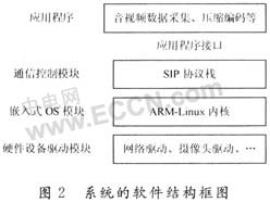 在系統(tǒng)硬件完成后,剩下的需要大量丁作來(lái)編寫(xiě)代碼實(shí)現(xiàn)各個(gè)功能模塊,最終實(shí)現(xiàn)整個(gè)系統(tǒng)。系統(tǒng)的軟件結(jié)構(gòu)如圖2所示。嵌入式OS是采用ARM-Linux內(nèi)核,硬件驅(qū)動(dòng)模塊主要是基于ARM