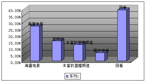 A、海量電影(26.71%) B、連續(xù)劇(15.28%) C、豐富的直播頻道(12.62%) D、圖文信息(6.19%)