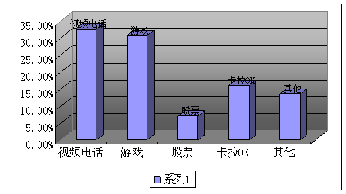 A、視頻電話(32.58%) B、游戲(30.6%) C、股票(7.06%) D、卡拉OK(16.17%) E、其他(13.59%)