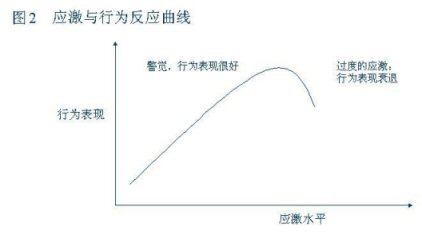 當應激水平處于一個較低的指標時人在心理上處于一個放松、不警覺的狀態(tài),從而關聯的行為表現就比較差但隨著應激水平的加大,相關聯的形為表現就會從中等向表現良好過渡。
