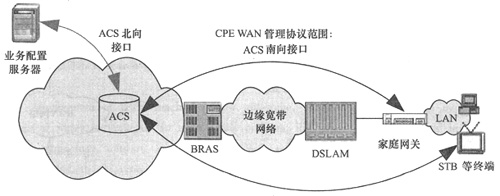 DSL Forum的終端管理模型如圖2所示,它確定了BOSS、ACS、DSLAM、家庭網(wǎng)關(guān)、終端設(shè)備的整體模型,被業(yè)界廣泛引用。