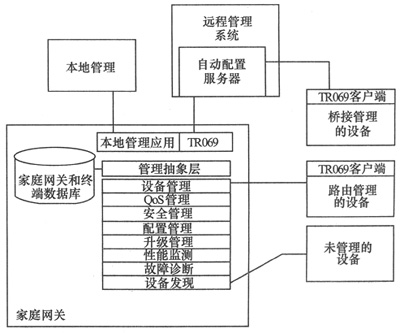 HGI規(guī)定的技術(shù)實(shí)現(xiàn)方式特點(diǎn)是,在架構(gòu)和遠(yuǎn)程管理協(xié)議方面全面采用DSL Forum技術(shù)體制,同時(shí)對(duì)家庭網(wǎng)關(guān)的功能進(jìn)行了額外的規(guī)定,增加了本地管理的使用場(chǎng)景,并定義該接口在本地采用HTTP+HTML方式,遠(yuǎn)程采用DSL Forum規(guī)定的方式(如圖4所示)。
