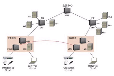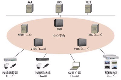 單級(jí)系統(tǒng)組網(wǎng)架構(gòu)如上圖所示。主要包括前端單元PU、客戶端單元CU、中心平臺(tái)(包括CMU、VTDU、NRU)以及支撐系統(tǒng)(包括AAA、ULS和NMS),各部分均接入IP