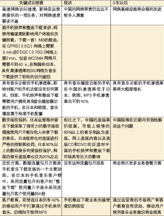 無線音樂市場(chǎng)的現(xiàn)狀、3年以后的情況以及成功的關(guān)鍵因素歸納總結(jié)見表2。