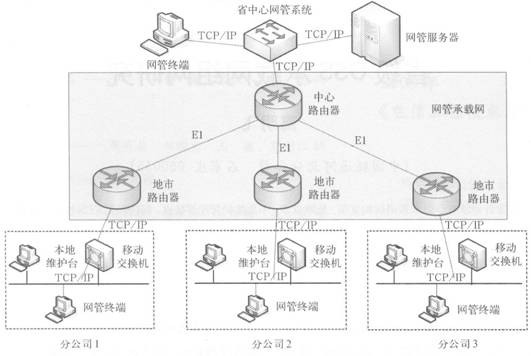 同樣以移動(dòng)網(wǎng)為例,例子中移動(dòng)交換機(jī)到維護(hù)終端支持TCP/IP方式,分公司具有本地維護(hù)終端和網(wǎng)管終端兩種類型的維護(hù)臺(tái)。本地維護(hù)終端通過以太交換機(jī)直接與移動(dòng)交換機(jī)相連;網(wǎng)元和網(wǎng)管終端通過以太網(wǎng)接入邊緣路由器,經(jīng)路由器接.el轉(zhuǎn)化以El方式接入到時(shí)隙抽取設(shè)備中,由于傳送網(wǎng)管信息占用帶寬較小,
