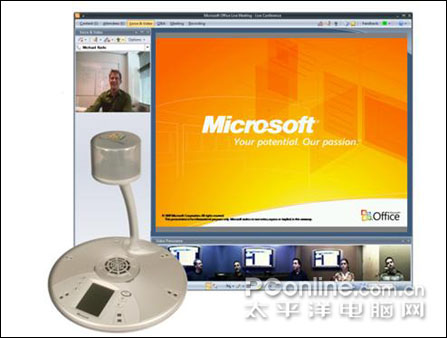 微軟Office RoundTable,音頻-視頻協(xié)作設(shè)備,帶有一個(gè)獨(dú)特的 360 度相機(jī)。在結(jié)合 Office Communications Server 2007 使用時(shí),RoundTable 還可交付卓越的會(huì)議體驗(yàn):將會(huì)議環(huán)境擴(kuò)展到多個(gè)位置。現(xiàn)場及遠(yuǎn)程位置的與會(huì)人員可以全景查看會(huì)議室中的每位成員,還可以在輪流發(fā)言時(shí)拉近特寫某個(gè)與會(huì)者。