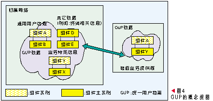 GUP中一個用戶相關(guān)的數(shù)據(jù)由多個數(shù)據(jù)組件構(gòu)成,每個組件又可以包含多個數(shù)據(jù)單元。在網(wǎng)絡(luò)中用戶數(shù)據(jù)每個數(shù)據(jù)組件只有一個主實(shí)例,但是可以有多個復(fù)制實(shí)例。用戶數(shù)據(jù)以組件為單元可以存放在不同的網(wǎng)絡(luò)實(shí)體中,應(yīng)用可以通過統(tǒng)一的訪問入口以標(biāo)準(zhǔn)接口訪問所有授權(quán)的數(shù)據(jù),這個入口功能由GUP