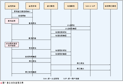 首先王先生的PDA通過歸屬網(wǎng)絡(luò)的業(yè)務(wù)發(fā)現(xiàn)服務(wù)器獲得旅行服務(wù)的主頁列表,他選擇一家訪問其旅行服務(wù),旅行服務(wù)通過其歸屬網(wǎng)絡(luò)的GAA&GUP對該終端進(jìn)行認(rèn)證以及提供旅行服務(wù)的授權(quán),成功后,旅行服務(wù)向地圖服務(wù)請求地圖信息并隨服務(wù)頁面一齊返回給終端,王先生點(diǎn)擊查找“離我最近的中餐館”按鈕,旅行服務(wù)將請求代理轉(zhuǎn)發(fā)給地圖服務(wù),后者返回中餐館列表(用戶的位置信息可以由用戶上報,或者由旅行服務(wù)查詢用戶歸屬網(wǎng)絡(luò)的位置服務(wù)獲得),旅行服務(wù)轉(zhuǎn)發(fā)給終端,當(dāng)王先生選擇一個中餐館并預(yù)訂時,旅行服務(wù)調(diào)用該餐館的預(yù)訂服務(wù),訂單傳給相應(yīng)服務(wù)人員,流程完成。