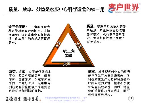 應(yīng)該說這三個方面是科學(xué)運(yùn)營的一個鐵三角,這是我們的理解,因為三角形,始終認(rèn)為是最穩(wěn)定、簡單、有效的圖形,也是我們在進(jìn)行內(nèi)部運(yùn)營的管理鐵架。質(zhì)量是客服中心最大的觸點(diǎn)當(dāng)中被客戶感知,從而帶來客戶忠誠的,如何管理質(zhì)量,那就至關(guān)重要。效率尤其是規(guī)模型的呼叫中心的運(yùn)營好壞,是與生產(chǎn)力的發(fā)展強(qiáng)相關(guān),而科技解放生產(chǎn)力是解決規(guī)模問題的關(guān)鍵。技術(shù)不僅是運(yùn)行更具效益率,同時還對企業(yè)的決策作出預(yù)先準(zhǔn)備,而不僅僅是事后反應(yīng)。很多年來,更多的企業(yè)是把客服中心視為成本中心,而事實上,效益的顯現(xiàn)讓我們陸續(xù)地走出了成本中心,它應(yīng)該是公司接觸客戶、挖掘客戶、挽留客戶、改進(jìn)客戶關(guān)系的一個最好工具,是用服務(wù)創(chuàng)造更有價值的客戶,來達(dá)到公司最終增加利潤的目標(biāo)。