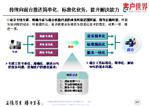 設(shè)立專線專席,并不是指專線越專越多,而是持續(xù)地向前臺推送簡單化、標(biāo)準(zhǔn)化的業(yè)務(wù),提升前臺一線的解決能力,所以我們重點(diǎn)以專線的技能專業(yè)化、業(yè)務(wù)復(fù)雜化、服務(wù)個性化,然后把簡單的形成規(guī)范標(biāo)準(zhǔn)的業(yè)務(wù)向前臺推送,保障專席的工作是專業(yè)化、精確化地解決10%的復(fù)雜問題,從而更多地去挖掘客戶的需求。而前臺客服的工作是用標(biāo)準(zhǔn)化、簡單化地解決90%的基本問題。