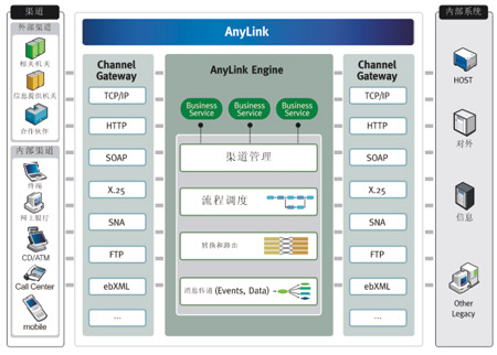 通過基于AnyLink的電子渠道統(tǒng)一接口平臺(tái)解決方案提供各類網(wǎng)關(guān)功能,可實(shí)現(xiàn)各種系統(tǒng)的整合,還提供報(bào)文轉(zhuǎn)換及路由的中介功能、管理和監(jiān)控所需的GUI工具,實(shí)現(xiàn)系統(tǒng)運(yùn)營和維護(hù)及開發(fā)的最佳化(如圖所示)。