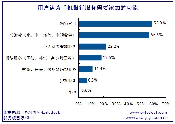 《2008年中國個人網(wǎng)上銀行市場用戶調研報告-手機銀行》研究發(fā)現(xiàn),用戶認為手機銀行需要添加的功能主要為購物支付和代繳費,分別占58.9%和56.5%。