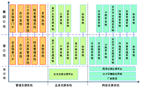 從系統(tǒng)的部署來看,主要集中在集團與省公司,其中,集團公司系統(tǒng)主要具備面向全公司的企業(yè)管理、經(jīng)營分析等功能;省公司從以職能管理為主逐步轉變?yōu)橐陨a管理為主,具有了越來越多的生產職能,在運營支撐系統(tǒng)建設中的作用更加突出;市公司的生產管理職能有所削弱,將主要負責市場的具體營銷、客戶支撐以及設備的現(xiàn)場維護等工作,F(xiàn)有系統(tǒng)主要存在以下幾個問題: