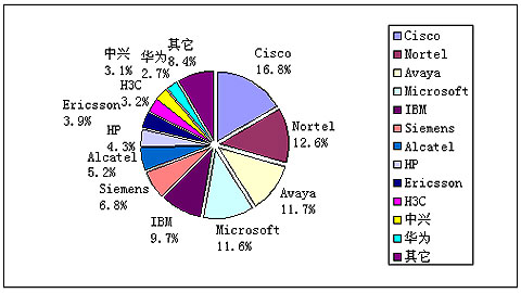 賽迪顧問預(yù)測,2009年中國統(tǒng)一通信市場中,在通信設(shè)備領(lǐng)域,Cisco市場份額將達到16.8%,繼續(xù)保持領(lǐng)頭樣的位置,而且市場份額有望繼續(xù)增加,Nortel和Avaya緊隨其后,市場份額分別將達到12.6%和11.7%。而在軟件廠商方面,Microsoft和IBM將繼續(xù)保持市場領(lǐng)先地位,市場份額分別將達到11.6%和9.7%,增長勢頭強勁。其它市場份額較大的國外統(tǒng)一通信廠商還有西門子、阿爾卡特、愛立信、HP等。在國內(nèi)方面,中興和H3C分別以約3%的市場份額占據(jù)領(lǐng)先位置。