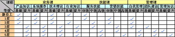 要實(shí)現(xiàn)分層培訓(xùn)管理,除了有適合的培訓(xùn)體系架構(gòu),更重要的還要有一個(gè)比較完善的培訓(xùn)課程體系。我們假設(shè)將這個(gè)呼叫中心分為5個(gè)服務(wù)等級(jí),那么在課程的設(shè)置上,我們就可以按照下表所示的方式來(lái)進(jìn)行安排。