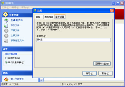 對(duì)于單個(gè)批量轉(zhuǎn)換的用戶而言,UMD舵手擁有智能斷章功能,完美解決了TXT電子書(shū)在手機(jī)上無(wú)法分章的難題。在“章節(jié)設(shè)置”選項(xiàng)卡中輸入用于制作章節(jié)目錄的關(guān)鍵字。例如:1、“第一章華山論劍”,則輸入的關(guān)鍵字可為:“第*章”;“一、華山論劍”,則輸入的關(guān)鍵字可為:“N、”;“【華山論劍】”,則輸入的關(guān)鍵字可為:“【*】”;“1-3-5節(jié):華山論劍”,則輸入關(guān)鍵字可為:“N-N-N