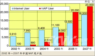 2002年~2007年中國WAP用戶數(shù)