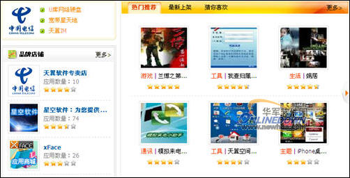 天翼空間應(yīng)用商城由四川電信與華為公司合作建設(shè),并于9月1日公測(cè)上線。天翼空間應(yīng)用商城分為游戲、主題、娛樂、生活、通訊、閱讀、旅行、商務(wù)、教育、財(cái)經(jīng)、工具等11個(gè)類別,超過500款應(yīng)用產(chǎn)品,入駐店鋪100余家,并引入5家品牌店鋪。目前,天翼空間已與百度、UCWEB、360安全衛(wèi)士,大頭網(wǎng)、3G門戶網(wǎng)等多家國(guó)內(nèi)知名IT企業(yè)合作開店。