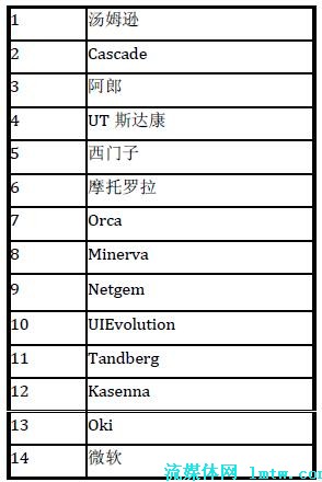 在中國(guó)市場(chǎng)上,UT 斯達(dá)康和中興公司暫時(shí)領(lǐng)先于其他公司。其中,UT 斯達(dá)康在海外也有不俗的表現(xiàn),如在印度和日本市場(chǎng)等;華為公司可以借助其整體解決方案的實(shí)力,有機(jī)會(huì)在下一代基于IMS 的IPTV 解決方案中脫穎而出。MRG 曾經(jīng)在2007 年3 月公布過一個(gè)市場(chǎng)調(diào)查,對(duì)IPTV 中間件及其市場(chǎng)影響力進(jìn)行了一個(gè)排名,具體的結(jié)果見表1。