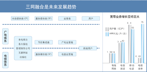 蘇少林:三網(wǎng)融合的推進對于我國在“后危機時代”拉動國內消費、形成新的經(jīng)濟增長點有著積極的意義。據(jù)測算,三網(wǎng)融合可帶動6000億元~7000億元的投資和消費,還可增加20萬個就業(yè)崗位,由此推動的固網(wǎng)寬帶業(yè)務將拉動GDP增長0.8個百分點。因此,電信監(jiān)管部門要站在大力推動信息產(chǎn)業(yè)和文化產(chǎn)業(yè)發(fā)展、提高國民經(jīng)濟和社會信息化水平、滿足人民群眾日益多樣的生產(chǎn)和生活服務需求的高度上來推進三網(wǎng)融合。