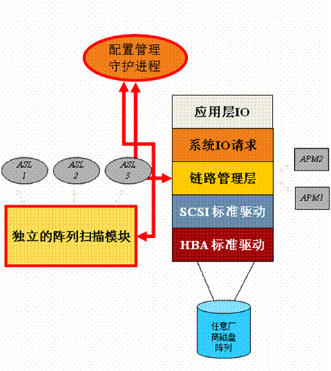 該技術(shù)的特點(diǎn)是通過(guò)主機(jī)層軟件方式建立存儲(chǔ)管理虛擬層,利用專業(yè)的第三方鏈路管理軟件解決磁盤(pán)陣列和主機(jī)的連通兼容性。其運(yùn)行依靠工作在存儲(chǔ)網(wǎng)絡(luò)鏈路管理層的軟件程序來(lái)完成,其體系架構(gòu)圖如下: