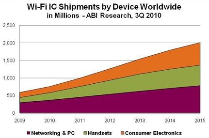 Wi-Fi技術(shù)現(xiàn)已被用于幾乎所有筆記本和上網(wǎng)本、智能電話和游戲設(shè)備。電話、音頻播放器、打印機(jī)、機(jī)頂盒以及其他消費(fèi)類電子設(shè)備對Wi-Fi技術(shù)的采用率也在不斷增加,來自Wi-Fi聯(lián)盟和多家調(diào)研機(jī)構(gòu)的數(shù)據(jù)印證了這種市場增長趨勢。2009年,僅在中國銷售的具備Wi-Fi功能的筆記本電腦就達(dá)到800萬臺,全球Wi-Fi設(shè)備認(rèn)證數(shù)量則增加了約50%,消費(fèi)類電子設(shè)備和電話數(shù)量增加了100%以上。截止到2010年7月,消費(fèi)類電子設(shè)施與電話類產(chǎn)品的認(rèn)證數(shù)量已經(jīng)超過了2009年全年數(shù)量,預(yù)計全年售出約8億臺Wi-Fi設(shè)備。