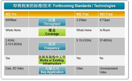在802.11a/b/g/n等標(biāo)準(zhǔn)不斷刷新更高覆蓋率和數(shù)據(jù)傳輸率的同時,新的標(biāo)準(zhǔn)如802.11ac、802.11ad等都正在嶄露頭角。Michael介紹說,與802.11n 600Mbps的流量相比,ac和ad的流量將分別高達(dá)3.2Gbps和6.7Gbps,頻率范圍分別為5.15GHz~5.9GHz和57GHz~66GHz。從應(yīng)用角度看,ac會定位在整個家居多個室內(nèi)的多媒體內(nèi)容共享;而ad由于傳輸距離有限,用于單個居室內(nèi)未壓縮高清視頻的短距離傳輸,即可能會成為HDMI標(biāo)準(zhǔn)的替代者。