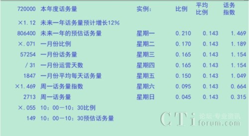 在上圖所示的比例分解過程中,我們假設去年的總來電量為720000個。在此基礎上,根據(jù)市場、銷售預測以及過去幾年歷史數(shù)據(jù)增長趨勢等數(shù)據(jù)測算出未來一年的話務量預計增長12%。這樣我們就得到了預計未來一年的總來電量為806400個。根據(jù)歷史數(shù)據(jù)的測算分析,一月份的來電量通常占全年總來電量的7.1%,因此明年一月份的來電量預計為57254個。由于呼叫中心是7X24小時運營的,所以一月份平均每天的來電量為57254/31=1847個。由于大多數(shù)呼叫中心的來電量規(guī)律是以一周為周期循環(huán)波動的,因此我們接下來要測算四個(或五個)周一的話務指數(shù),以覆蓋四個或五個周一的來電量情況。我們用周一來電量占全周來電量的相對比例除以其七分之一的絕對比例,得出周一的來電量指數(shù)為1.469,也就是說,周一的來電量是相對較多的,相當于一周日平均來電量的約147%。由此我們得出周一話務量為2713個。然后我們再根據(jù)由歷史數(shù)據(jù)測算出的周一一天中48個半小時時段占全天來電量的比例測算出周一上午10:00-10:30的來電量為149個。剩下的周二至周日都可以采用同樣的方法來推算預測。