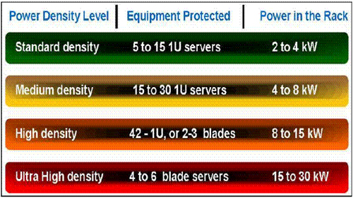 當(dāng)企業(yè)部署刀片式服務(wù)器來宿主其虛擬服務(wù)器時(shí)尤其如此。刀片式服務(wù)器采用多個(gè)即插即用型處理裝置,它們共享公共的電氣系統(tǒng)、電源、風(fēng)扇、電纜和存儲器。這樣的安排節(jié)省了數(shù)據(jù)中心的占地面積,簡化了硬件管理,并提高了IT靈活性。然而,這同時(shí)也大大增加了運(yùn)算密度。結(jié)果,刀片式服務(wù)器產(chǎn)生大量的熱,從根本提高了機(jī)柜級供電要求。確實(shí),一個(gè)典型的傳統(tǒng)服務(wù)器機(jī)柜可能需要4至6 kW電力,而一個(gè)典型的布滿刀片式機(jī)架的機(jī)柜則可能需要高達(dá)30 kW的電力,遠(yuǎn)遠(yuǎn)超過許多電源和冷卻系統(tǒng)的處理能力。