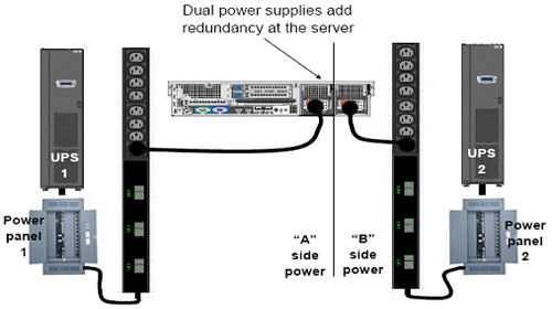2(N)架構(gòu)與含有雙電源的服務(wù)器配合使用。在這種排列中,每個(gè)電源一般都是利用一個(gè)獨(dú)立的供電路徑。那樣,即使整個(gè)動力總成都關(guān)機(jī)進(jìn)行維修或維護(hù),服務(wù)器仍然可用。