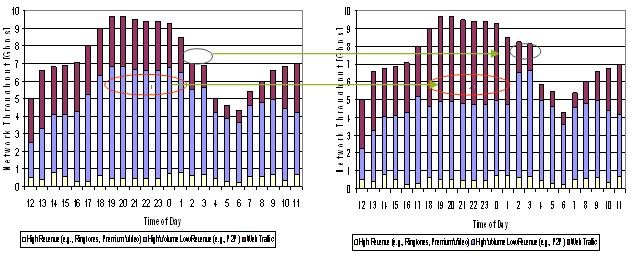 合理調(diào)配資源是指應(yīng)用智能管道技術(shù),并結(jié)合激勵(lì)型市場定價(jià),運(yùn)營商能夠減少網(wǎng)絡(luò)空載時(shí)間或降低低載率,在網(wǎng)絡(luò)忙時(shí)留出更多的資源給高付費(fèi)用戶和業(yè)務(wù),從而在相同的資源下獲得更高的收益。下圖是某運(yùn)營商引入智能管道前后的數(shù)據(jù)分布效果圖,忙時(shí)高付費(fèi)業(yè)務(wù)增加,非忙時(shí)總業(yè)務(wù)量增加(主要來自于低付費(fèi)業(yè)務(wù)),這些都為運(yùn)營商帶來了額外的收入。實(shí)際增收效果會(huì)因智能管道策略的力度和動(dòng)態(tài)調(diào)整的效果而有不同,通常都會(huì)增加幾個(gè)百分點(diǎn)甚至更高。