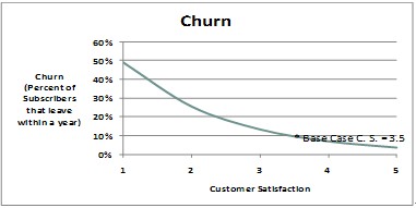 部署智能管道可以在網(wǎng)絡(luò)容量和業(yè)務(wù)保障方面產(chǎn)生積極影響。針對高端用戶提供免溢價(jià)的高價(jià)值服務(wù)/業(yè)務(wù),會(huì)提高高端用戶群體的滿意度。高端用戶是高額利潤的保障,是所有運(yùn)營商爭取的目標(biāo),而用戶滿意度是決定他們是否留在網(wǎng)絡(luò)的最重要因素。應(yīng)用智能管道后,預(yù)期年離網(wǎng)率將下降1%~2%。離網(wǎng)率的降低,將使用戶平均停留在本網(wǎng)絡(luò)的周期加長,從而增加收入并減少新用戶的獲取成本。這一部分的價(jià)值和意義,將大于資源合理分配和差異化業(yè)務(wù)的價(jià)值。下面的圖表顯示了離網(wǎng)率和用戶滿意度的關(guān)系。