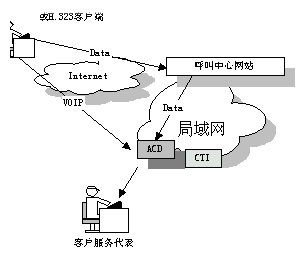 國際上一些先進的 呼叫中心產(chǎn)品供應商現(xiàn)在已經(jīng)把 Web 技術(shù)引入到他們的產(chǎn)品中了。通過屏幕上的一個按鈕可以利用 Internet 電話把客戶和呼叫中心連接起來?蛻羰褂靡粋很普通的帶有麥克風﹑聲卡以及傳輸速率不小于 28.8 kbps 的Modem 的多媒體 PC 機,并配有 Web 瀏覽器以及與 H.323兼容的應用軟件就可以利用把他們連接到 Web 站點的那條電話線與呼叫中心的座席員交談。其簡單示意圖如下: