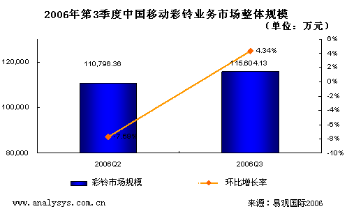 研究表明,2006年第3季度,CRBT業(yè)務(wù)略有反彈。其中移動彩鈴業(yè)務(wù)的分帳前信息費接近16000萬元,較上個季度小幅度反彈2.6%。但是總體上仍然呈現(xiàn)徘徊態(tài)勢,并沒有走出低級飽和區(qū)。