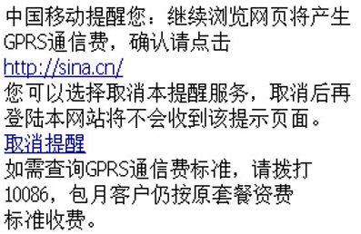 從2007年5月17日起,通過手機(jī)訪問WAP網(wǎng)站,中國(guó)移動(dòng)向用戶主動(dòng)提供一個(gè)收費(fèi)提示頁面,提醒用戶“正在使用手機(jī)上網(wǎng)業(yè)務(wù),若繼續(xù)瀏覽網(wǎng)頁,將會(huì)產(chǎn)生GPRS通信費(fèi)”。但打開中國(guó)移動(dòng)夢(mèng)網(wǎng)頁面,則不會(huì)有上述提示。