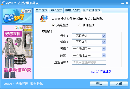 用戶點擊QQ面板上的"查找"圖標(biāo),將會發(fā)現(xiàn)在原有的3種查找通道外,新增了"企業(yè)用戶查找"功能。QQ用戶可以選擇分類查找,通過行業(yè)、省份、城市、地區(qū)等的匹配,來找到最符合查找條件的企業(yè),同時也可以通過關(guān)鍵字來模糊查找目標(biāo)企業(yè)。如果確知企業(yè)的全稱或者企業(yè)QQ賬號,則可以一步到位精確查找到目標(biāo)企業(yè)。