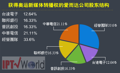 據(jù)IPTVWorld了解,2008年第29屆北京奧運(yùn)比賽轉(zhuǎn)播權(quán)臺灣區(qū)網(wǎng)絡(luò)與手機(jī)平臺轉(zhuǎn)播權(quán)。國際奧委會 (IOC)除了證實這項消息,也表示,經(jīng)過度。另外,鑒于愛爾達(dá)在美國職棒等運(yùn)動賽事和韓劇等數(shù)字內(nèi)容版權(quán)經(jīng)營與后制服務(wù)擁有豐富的實務(wù)經(jīng)驗,中華電在今年4月進(jìn)一步以溢價參與愛爾達(dá)增資,取得21%的股權(quán),成為愛爾達(dá)除了經(jīng)營團(tuán)隊外最大的股東。