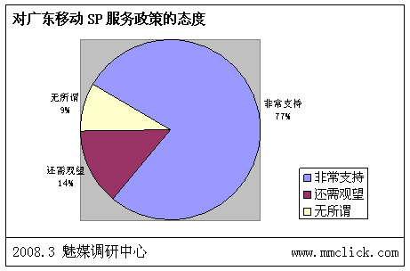 最近公布的空中網(wǎng)財(cái)務(wù)報(bào)表的數(shù)據(jù)顯示空中網(wǎng)總收入環(huán)比增長,結(jié)合之前廣東移動(dòng)推出:廣東移動(dòng)向重服務(wù)轉(zhuǎn)變 首推“6+1”服務(wù),SP行業(yè)可以說是暖風(fēng)頻吹。魅媒無線行業(yè)調(diào)研中心隨機(jī)從3月3日到3月5日隨記電話采訪50多家全網(wǎng)以及廣東省網(wǎng)SP公司相關(guān)負(fù)責(zé)人,對最近的SP行業(yè)的政策調(diào)整進(jìn)行調(diào)查,有以下的數(shù)據(jù):