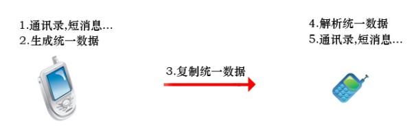 對(duì)于新出的手機(jī)型號(hào),如果可以通過手機(jī)直接生成統(tǒng)一格式的交換數(shù)據(jù),并且可以通過手機(jī)直接解析其他手機(jī)生成交換數(shù)據(jù),示意圖如下: