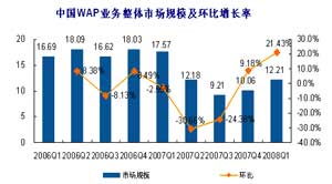 中國(guó)WAP業(yè)務(wù)整體市場(chǎng)規(guī)模及環(huán)比增長(zhǎng)率(來(lái)源:易觀國(guó)際)