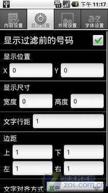 針對Android大屏觸摸手機(jī)的特性,此版來電通也來/去電樣式中添加了許多個(gè)性化元素,用戶可以根據(jù)自己的需求來設(shè)定來電號碼在屏幕中顯示的位置,通過X、Y坐標(biāo)來設(shè)定,而且還可以設(shè)定來電的背景圖片,相對于Symbian S6O平臺上的個(gè)性化設(shè)置來說,此版本要更豐富。