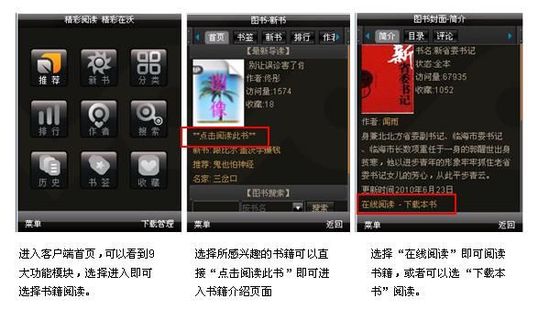 據(jù)了解,中國(guó)聯(lián)通手機(jī)閱讀業(yè)務(wù)分為三個(gè)專區(qū)。目前,圖書(shū)頻道包括16類24000余本圖書(shū),雜志頻道包括17類500余本雜志。此外,用戶可選擇進(jìn)入聽(tīng)書(shū)頻道,下載并收聽(tīng)圖書(shū)。